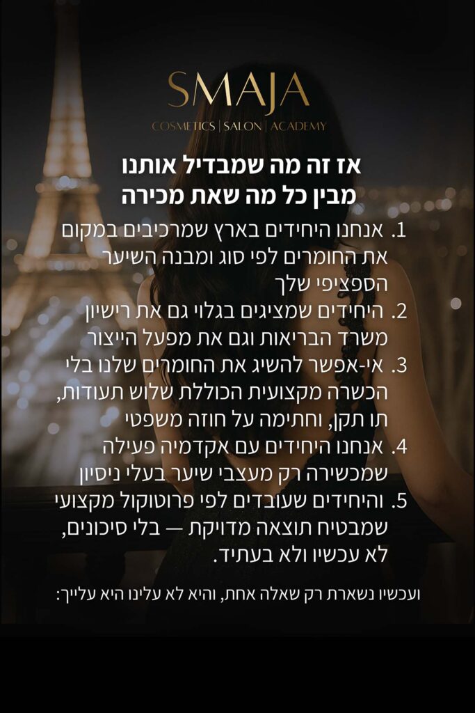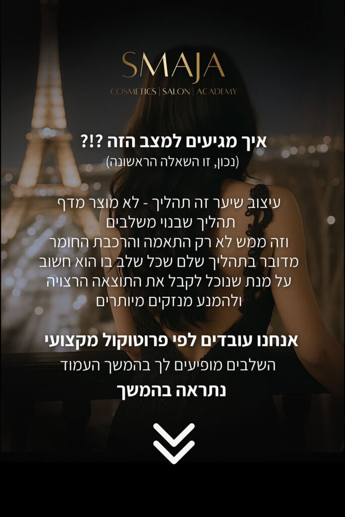 שאלה מצוינת. הטיפול הזה אינו מבוסס על מוצר מדף שמתאים לכולם – אלא על התאמה והרכבה אישית ומדויקת. אנחנו מתחילים באבחון מעמיק של סוג השיער ולאחר תיאום ציפיות נרכיב עבורך במקום פורמולה ייחודית שמתאימה רק לסוג השיער שלך. זו בדיוק הסיבה שלמעלה מ־3,500 נשים כבר הצליחו לראות שינוי אמיתי אחרי אין-ספור ניסיונות כושלים.